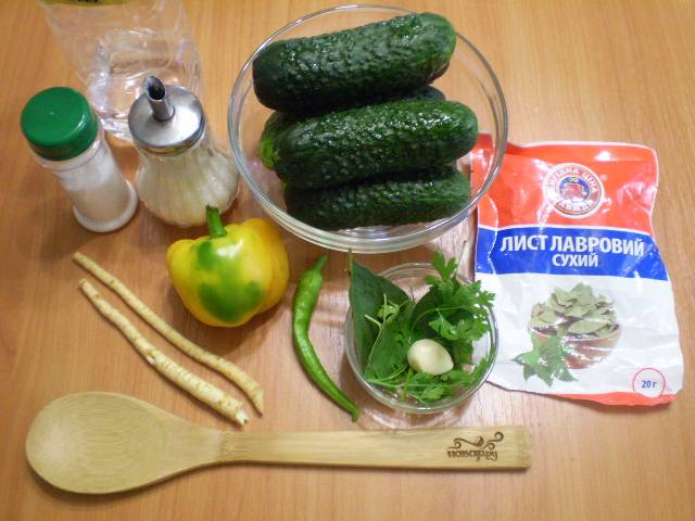 Хрен придает огурцам остроту, а также, благодаря ему, они получаются хрустящими. Можно использовать как листья, так и молоденькие корешки хрена.