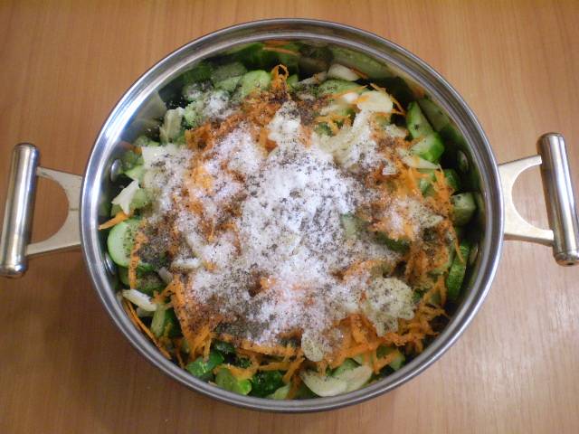 Это замечательный салатик из огурцов и моркови со специями на зиму. Отлично хранится всю зиму!