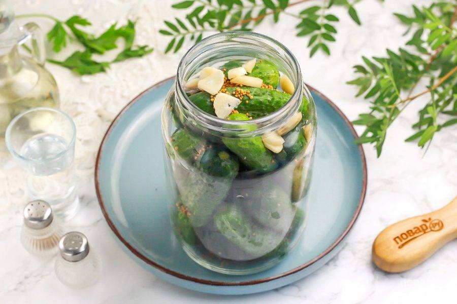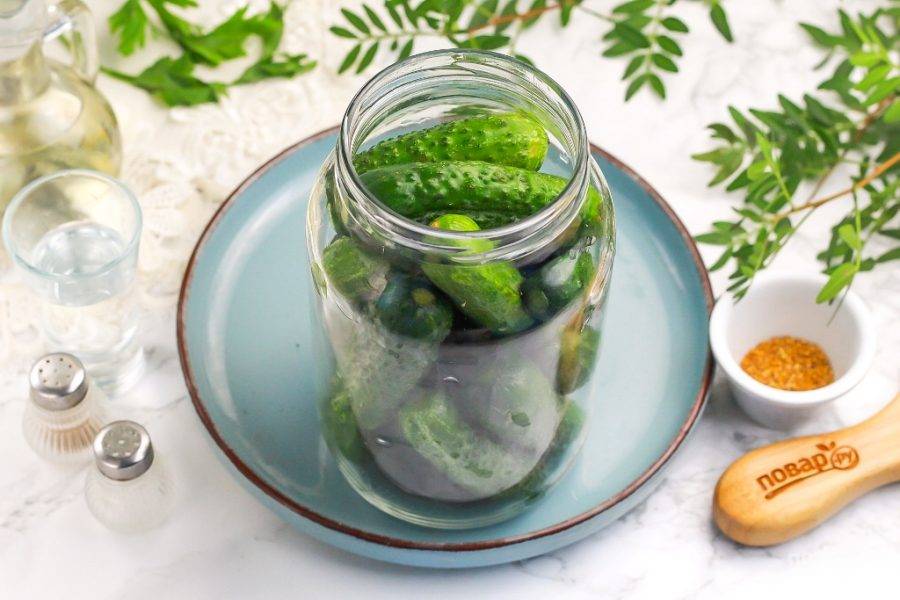 Выложите в чистую банку сначала крупные огурцы, а затем мелкие, заполняя ими пустоты в емкости до верха.
