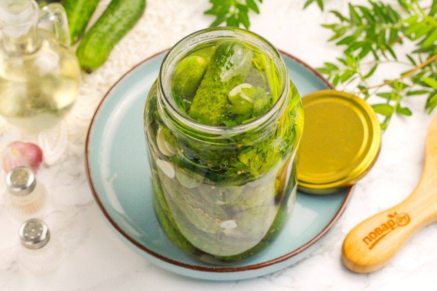 После чего снова залейте огурцы в банке кипящим маринадом и сразу же закрутите крышку по резьбе или с помощью ключа для консервации.