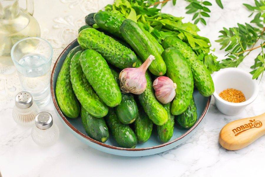 Подготовьте указанные продукты. Промойте свежие огурцы от пыли, грязи, смывая шипы с их поверхности. По желанию можете срезать хвостики с овощей. Очистите зубчики чеснока и промойте.