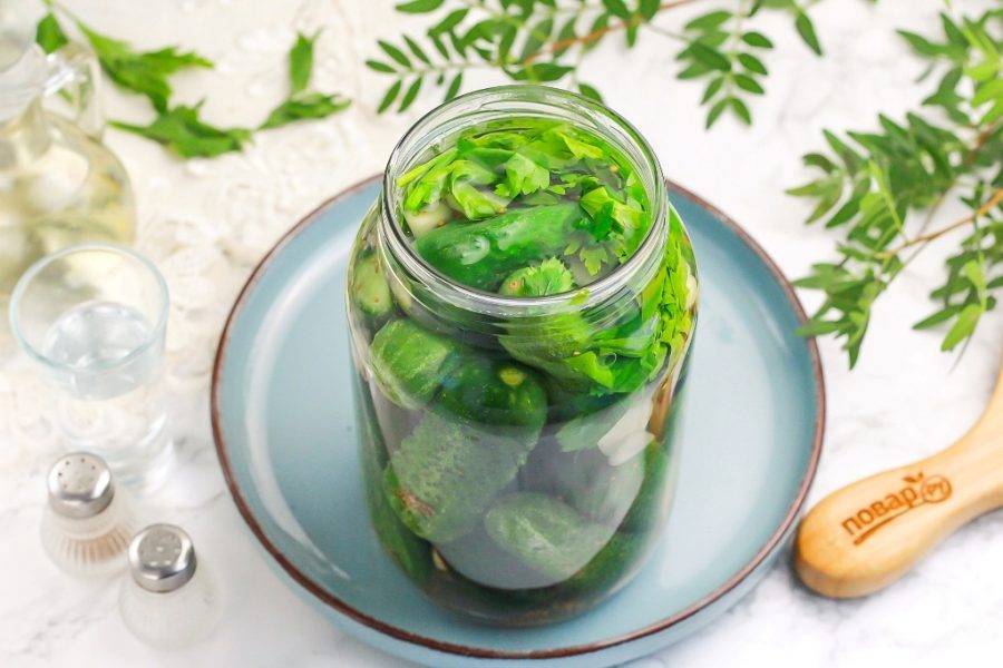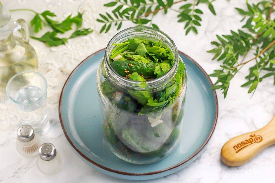 Промойте петрушку в воде, срежьте стебли и выложите сверху на огурцы.