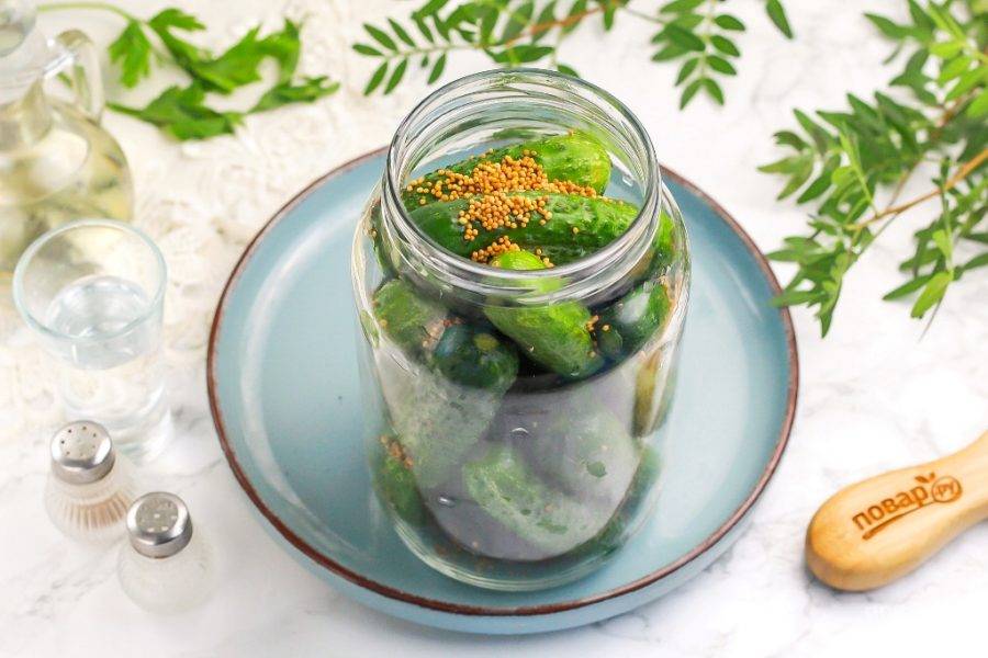 Всыпьте зерна горчицы или добавьте 1 ч.л. горчичного порошка. По желанию такую специю можно и не использовать, если не любите ее вкус.