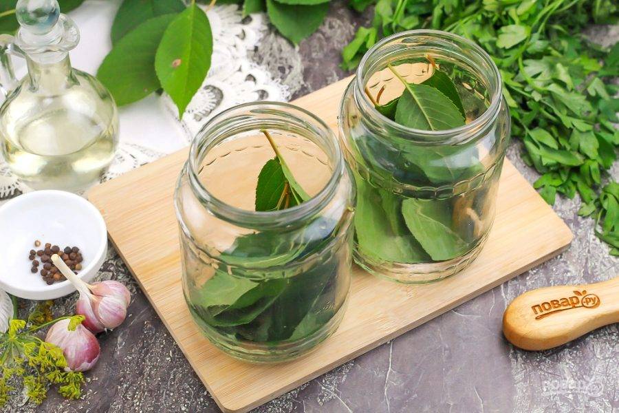 Промойте листья вишни или дуба, хрена, выложите их в чистые сухие банки на дно. Туда же добавьте по зонтику укропа. Можно использовать семена укропа, но не свежую зелень!