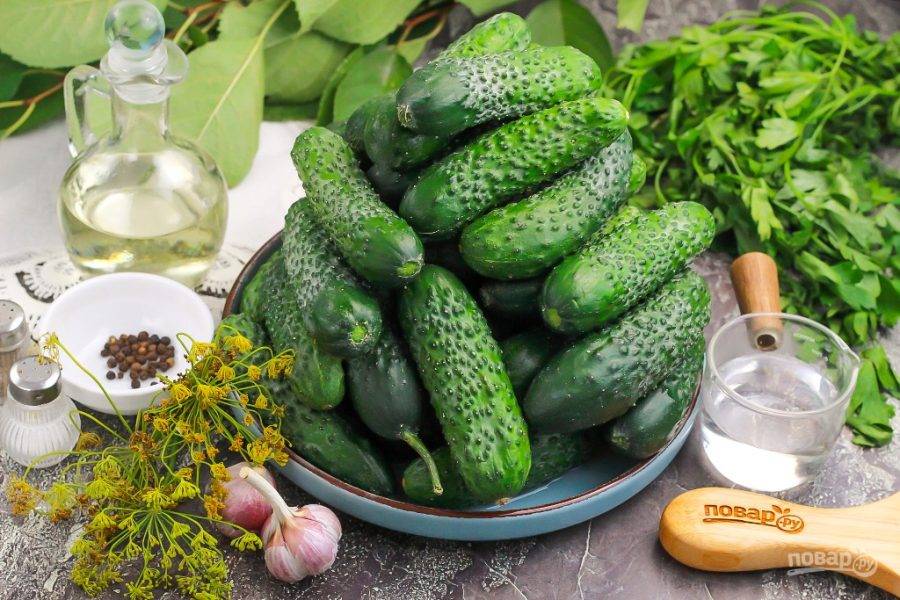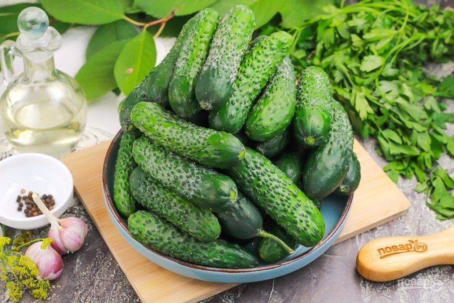 Подготовьте указанные продукты. Приобретите свежие, плотные огурцы среднего или мелкого размера. Замочите их на 1-2 часа в холодной воде.