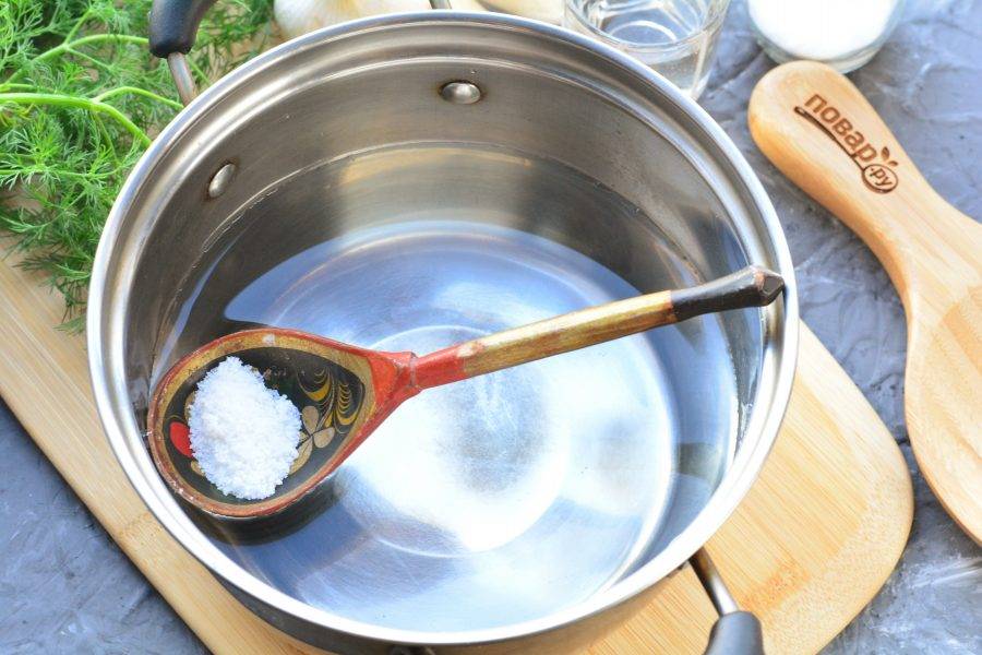 Сварите маринад. В кипящую воду всыпьте соль, сахар, перемешайте. Влейте уксус, и сразу выключите огонь.