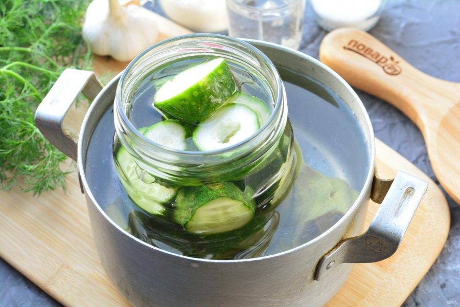Залейте огурцы в банках горячим маринадом. Стерилизуйте огурцы 5-7 минут в кастрюле.