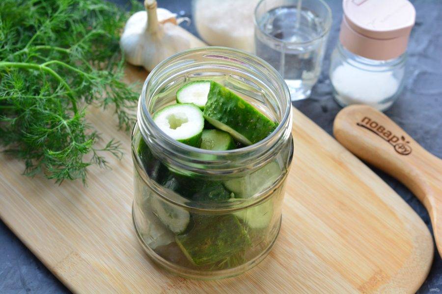 Огурцы промойте, срежьте хвостики, нарежьте плоды крупными кружками.