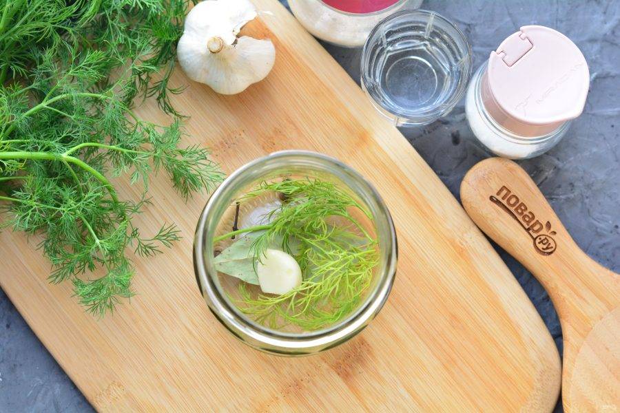 Банки простерилизуйте удобным способом, на дно сложите почищенные зубчики чеснока, лавровый лист, душистый перец и веточки укропа.
