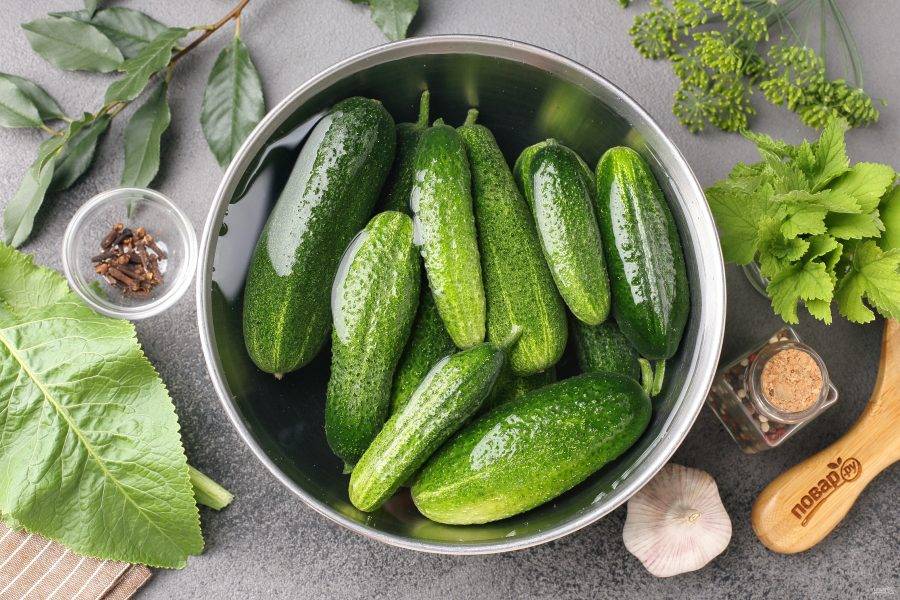 Огурцы хорошо промойте. Если огурцы не прямо с грядки, то залейте их холодной водой и оставьте на пару часов.