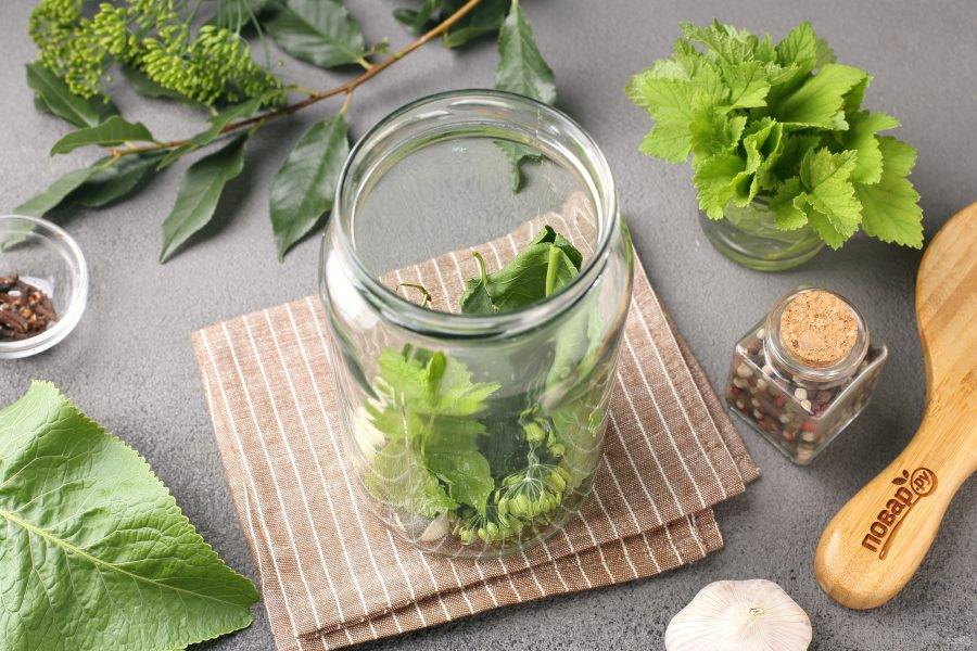 Банки хорошо простерилизуйте любым удобным способом. Выложите на дно гвоздику, перец горошком, очищенные зубчики чеснока, промытые под проточной водой листья смородины, вишни, зонтики укропа и лист хрена.