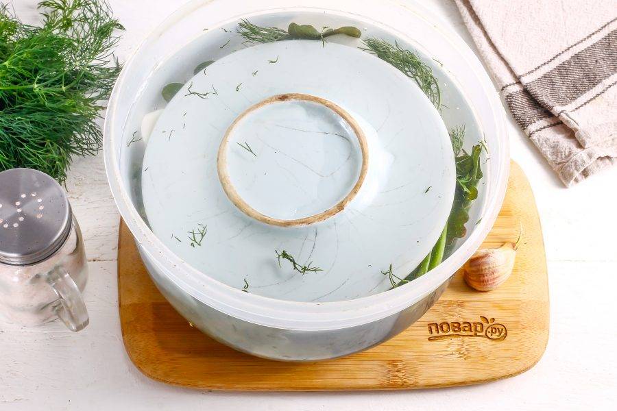 Влейте холодную воду, перемешайте содержимое емкости и накройте сверху тарелкой или блюдцем, поместите сверху гнёт и оставьте на 3 дня для засолки при комнатной температуре. Каждый день перемешивайте содержимое емкости.