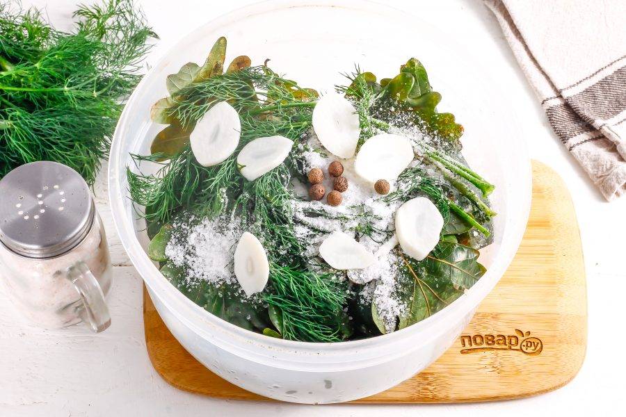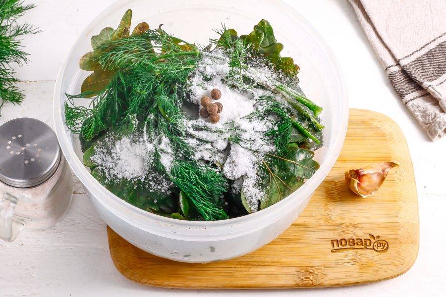 Выложите стебли укропа, всыпьте соль и горошины душистого перца.