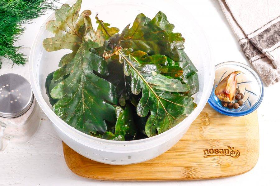 Воду слейте, дубовые листья промойте и выложите в глубокую емкость вместе с огурцами.