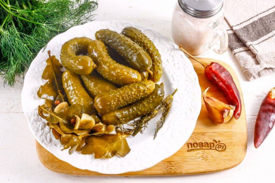 Чтобы приготовить вкусные хрустящие соленые огурцы, вам не нужно искать листья хрена — замените их дубовыми листьями, которые не дадут овощам раскваситься. Срок засолки — 3 дня при 18 градусах.