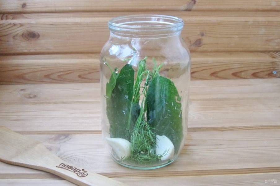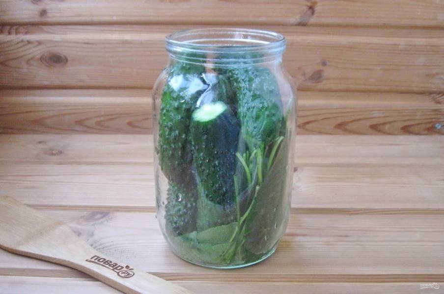Огурцы предварительно помойте и подержите несколько часов в холодной воде. Благодаря этой процедуре, они будут хрустящими. Обрежьте кончики у огурцов, в которых накапливаются нитраты, и выложите огурцы в банку.