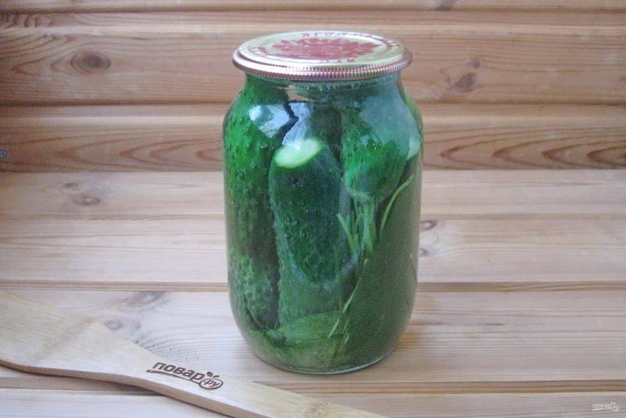 Закатайте банку крышкой, переверните верх дном и накройте одеялом. Оставляйте так до полного остывания банки. Храните огурцы в прохладном помещении.