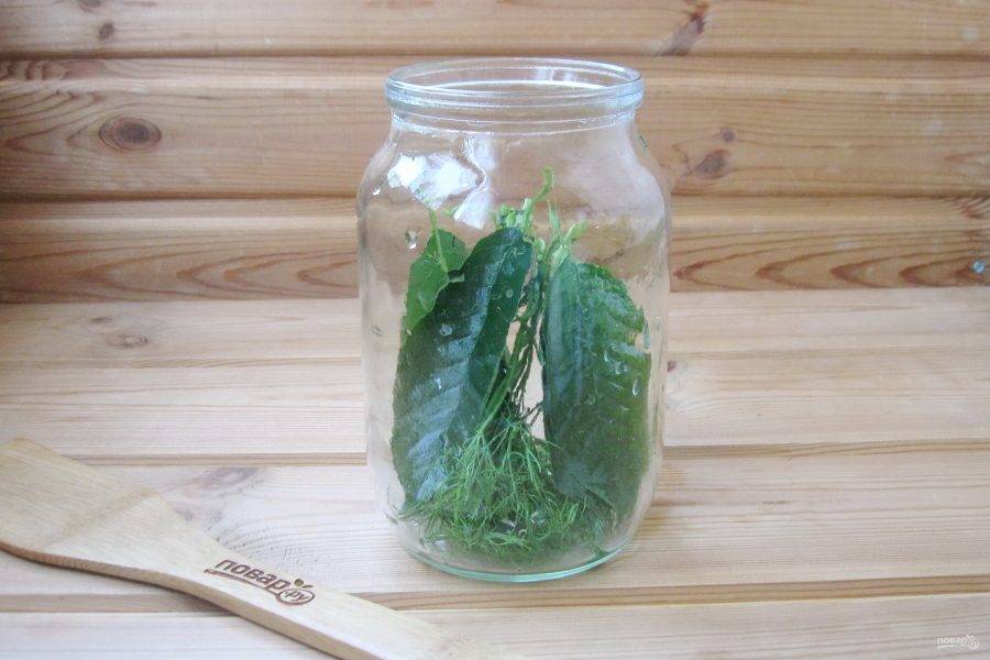 В стерилизованную банку выложите помытый укроп и листья вишни.