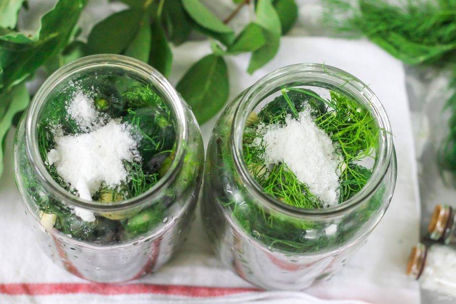 Промойте укроп, выложите в емкости. Всыпьте в каждую банку по 1,5 ст. л. соли без горки.