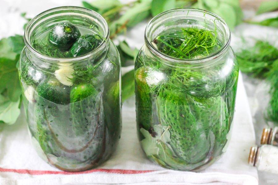 Влейте холодную воду, отфильтрованную или из-под крана в банки до плечиков емкостей, так как рассол будет "бродить" и поднимется примерно на 1,5 см.