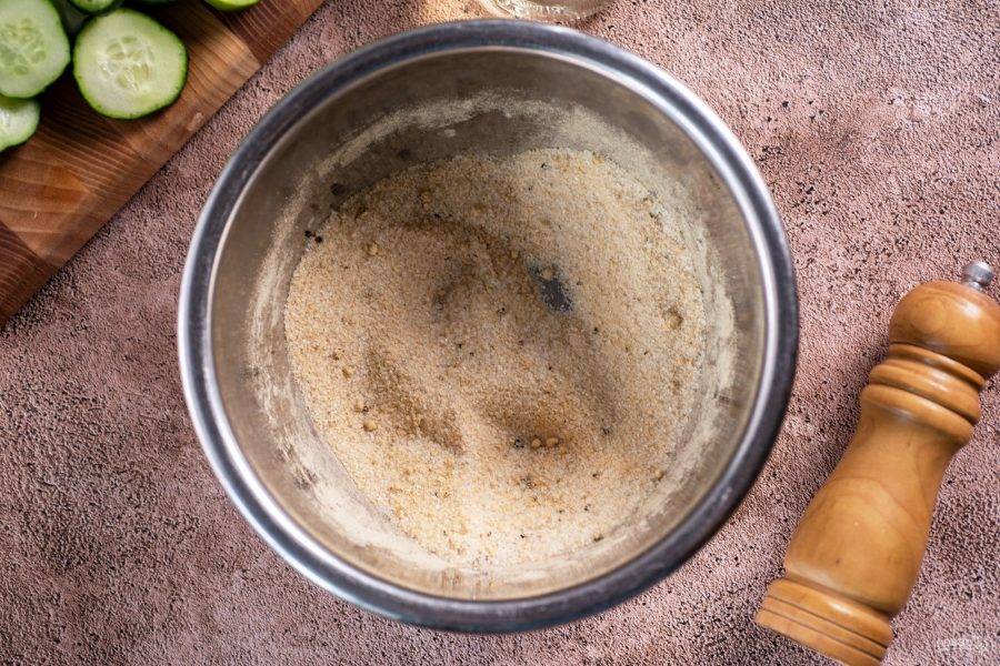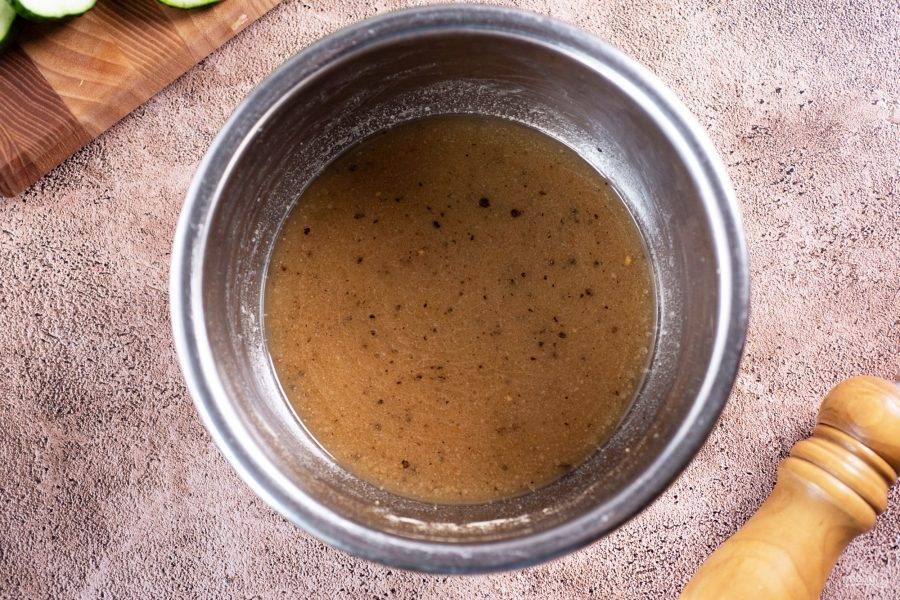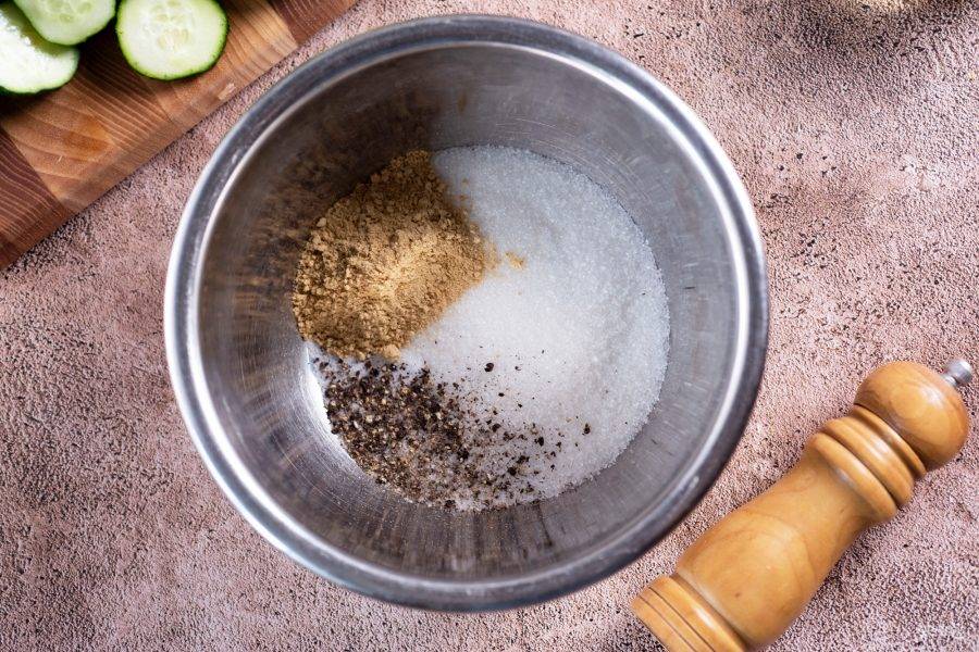 В миску высыпьте сахар, соль, перец черный молотый, горчицу.