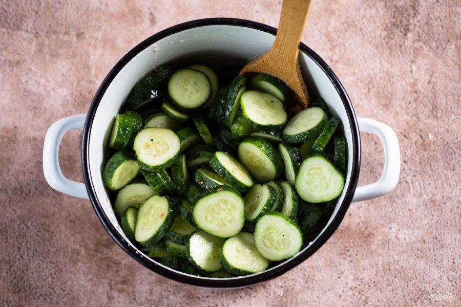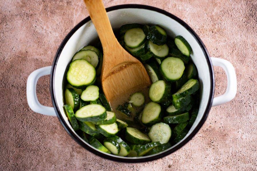 Выложите в просторную кастрюлю все нарезанные огурцы, залейте к ним горчичную заливку, перемешайте. Кастрюлю накройте крышкой и оставьте на столе примерно на 2 часа.