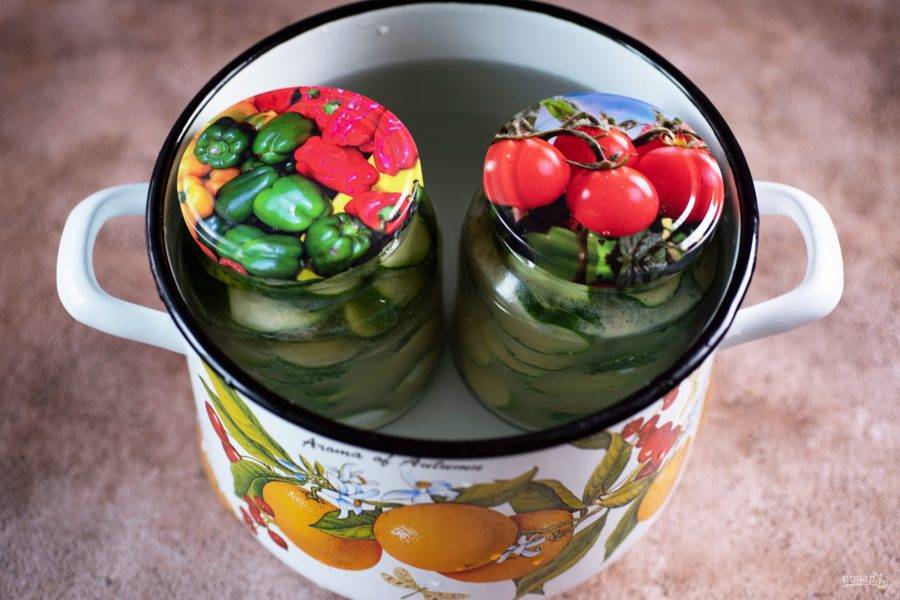 Заполненные банки прикройте крышками, поставьте их на дно объемной кастрюли, залейте воду по плечики банок. Кастрюлю с банками поместите на средний огонь, дождитесь момента закипания воды и стерилизуйте заготовку 20 минут.