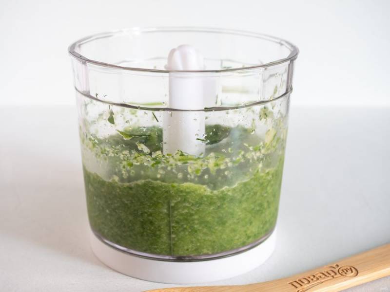 Пробейте огурцы с зеленью до консистенции пюре.