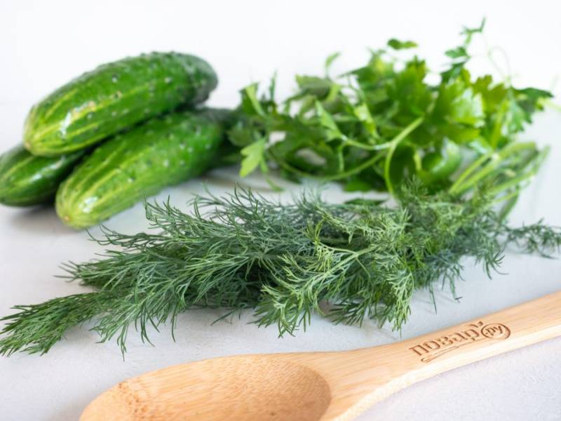 Подготовьте все необходимые ингредиенты. Огурцы и зелень тщательно помойте.