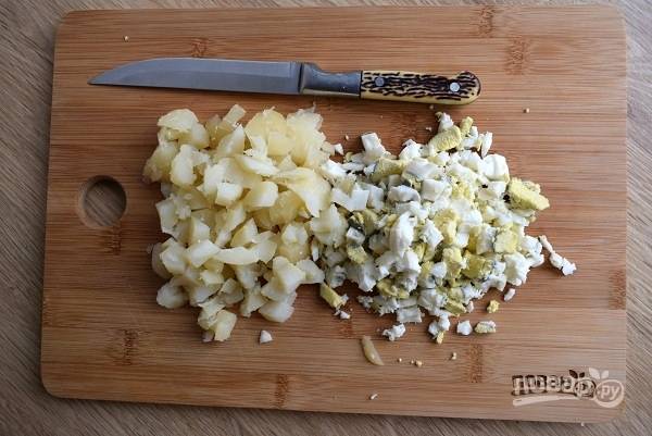 2. Яйца и картофель сложите в кастрюлю, залейте холодной водой, доведите до кипения, уменьшите огонь и варите 8-10 минут до готовности яиц. Яйца достаньте из кастрюли и переложите в холодную воду, остудите. Картофель продолжайте варить еще 10 минут (до мягкого состояния), затем слейте воду, остудите. Очистите яйца и картофель, нарежьте мелкими кубиками.