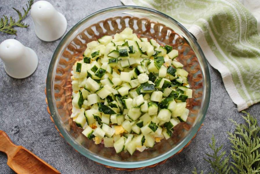 Свежие огурчики порежьте мелким кубиком и добавьте в миску.
