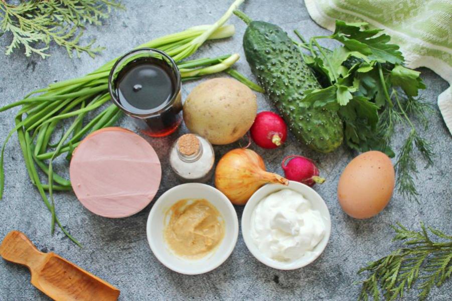 Подготовьте все необходимые ингредиенты для приготовления окрошки с горчицей и сметаной на квасе. Овощи и зелень вымойте и обсушите. Овощи и зелень отварите до готовности и остудите.