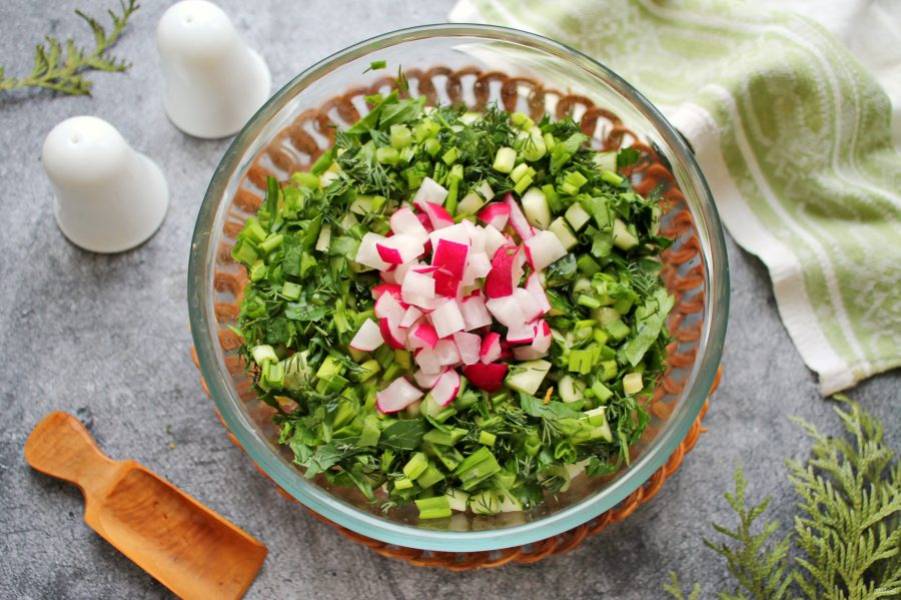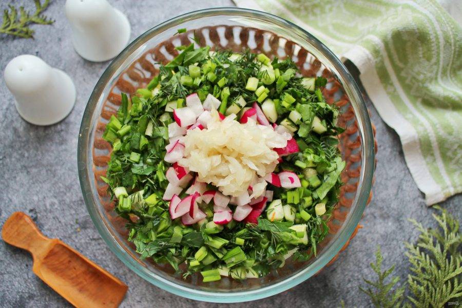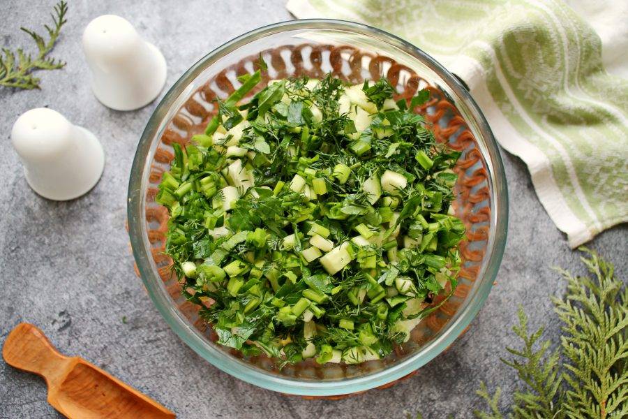 Репчатый лук мелко порежьте и помните вместе с солью. Это позволит избавиться от горечи и придаст пикантную нотку окрошке. Добавьте ее в миску с окрошкой.