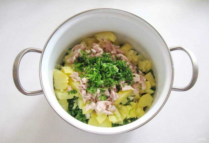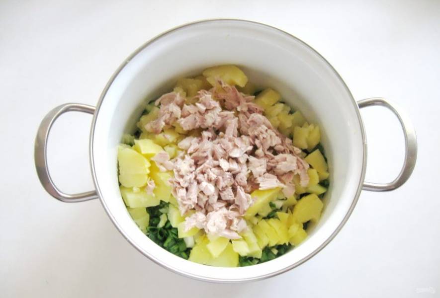 Отварную курицу также мелко нарежьте и добавьте в кастрюлю.