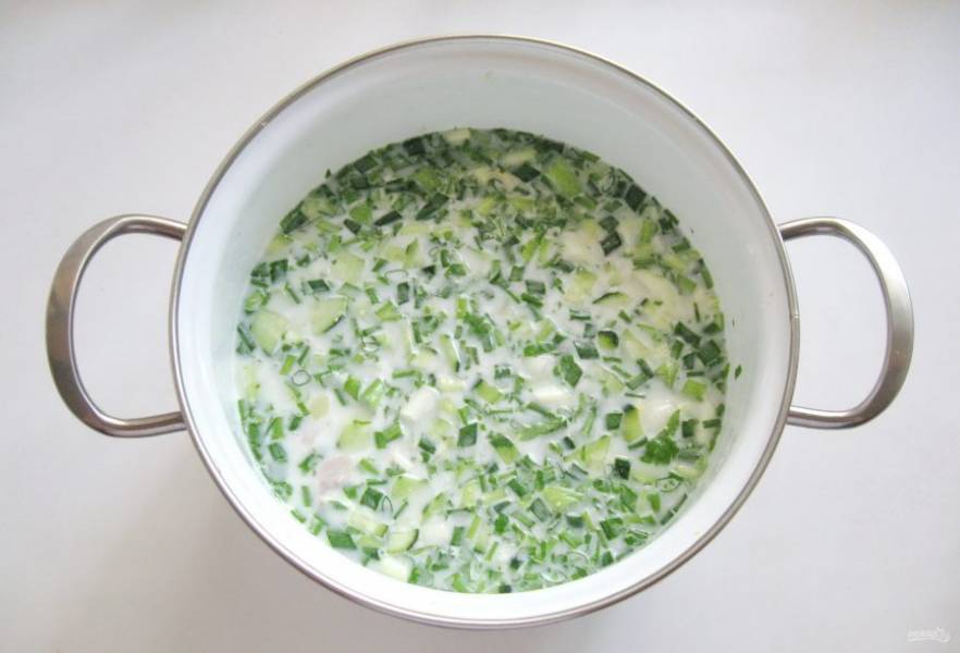 Огурец свежий помойте, очистите и мелко нарежьте. Добавьте в кастрюлю.