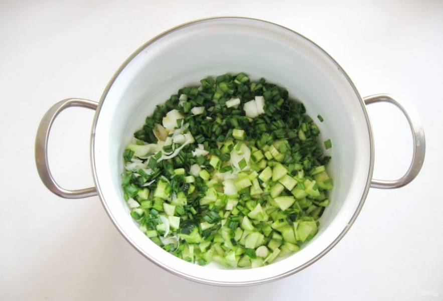 Зеленый лук помойте и мелко нарежьте. Выложите в кастрюлю.