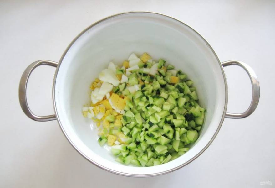 Яйца сварите вкрутую, охладите, очистите и мелко нарежьте. Выложите в кастрюлю.
