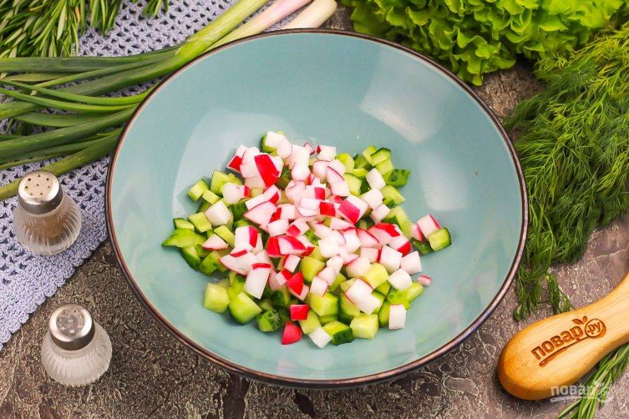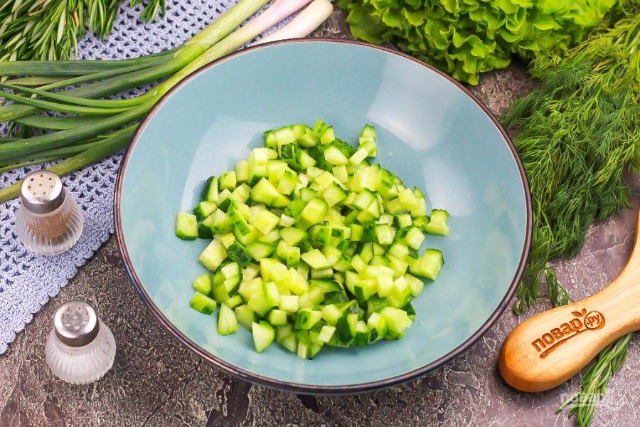 Нарежьте огурцы мелкими кубиками и высыпьте нарезку в салатник или глубокую миску.