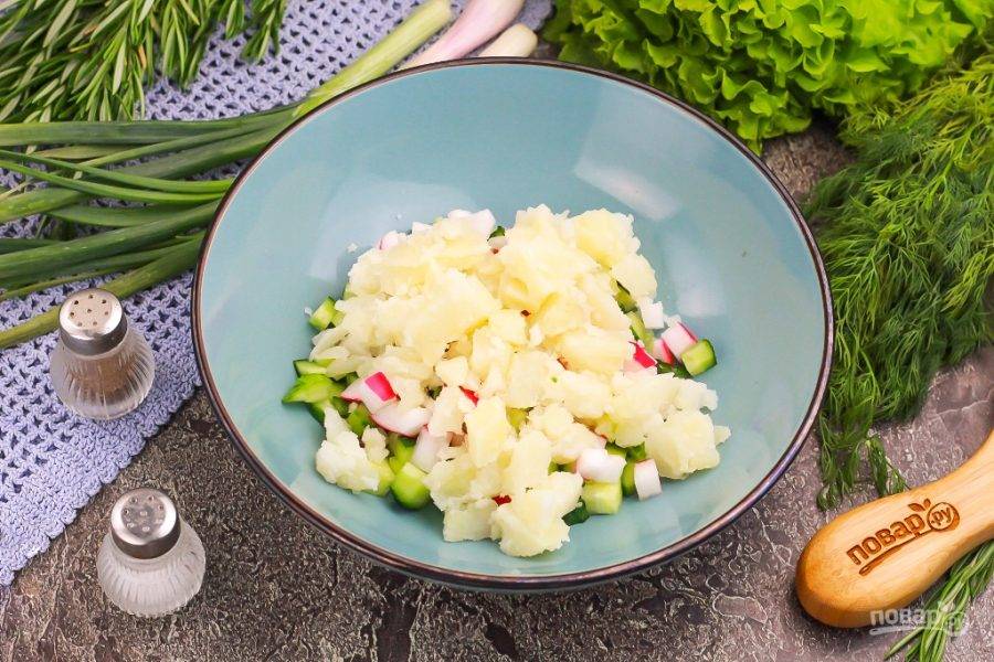 Нарежьте мелкими кубиками вареный картофель или натрите его на терке с крупными ячейками в салатник.