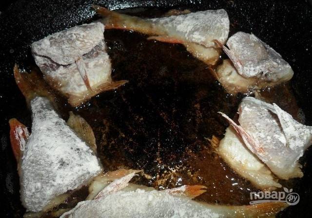 Обваляйте окуня в муке. Выложите кусочки на разогретое масло в сковороде.