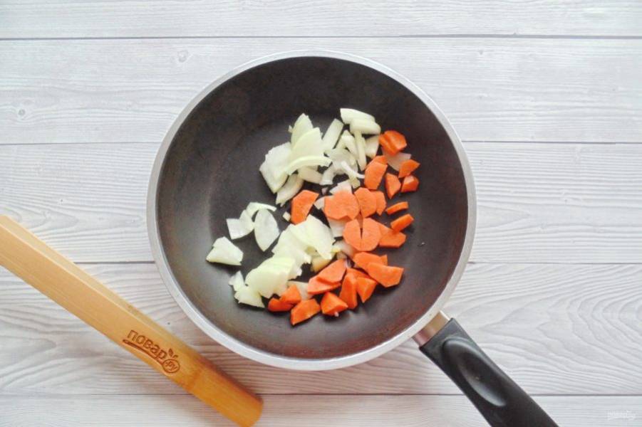 Очистите и ополосните морковь и лук. Нарежьте мелко. Переложите в сковороду с маслом.