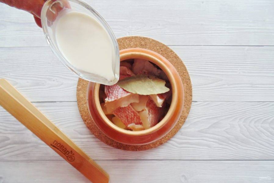 Влейте в горшочек сливки, добавьте лавровый лист и снова поставьте горшочек в духовку.