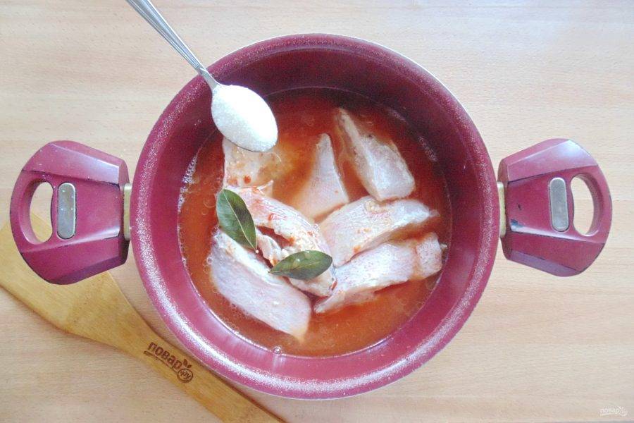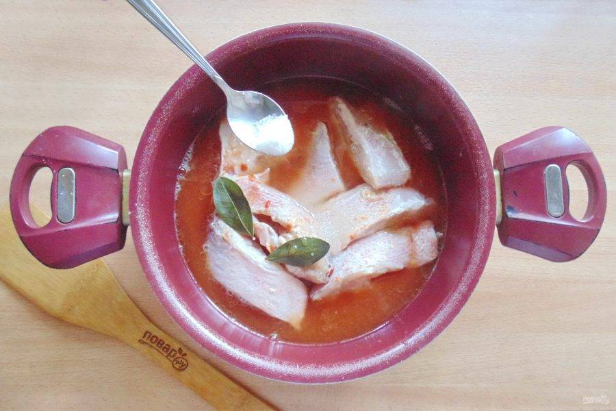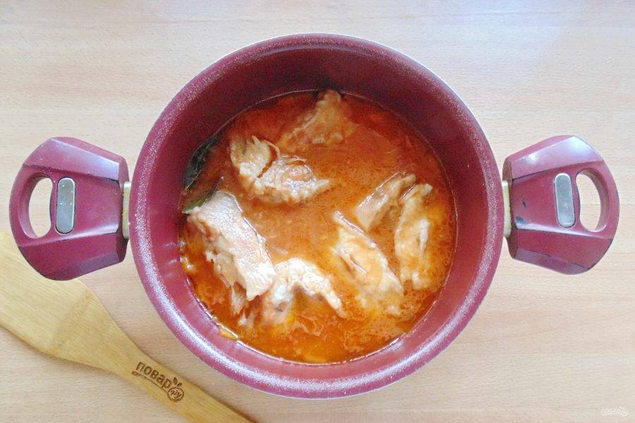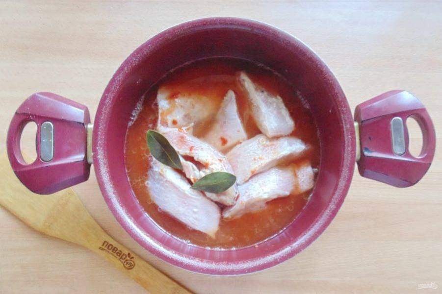 Разведите томатную пасту в 250-300 мл. воды и влейте в кастрюлю. Добавьте лавровый лист.