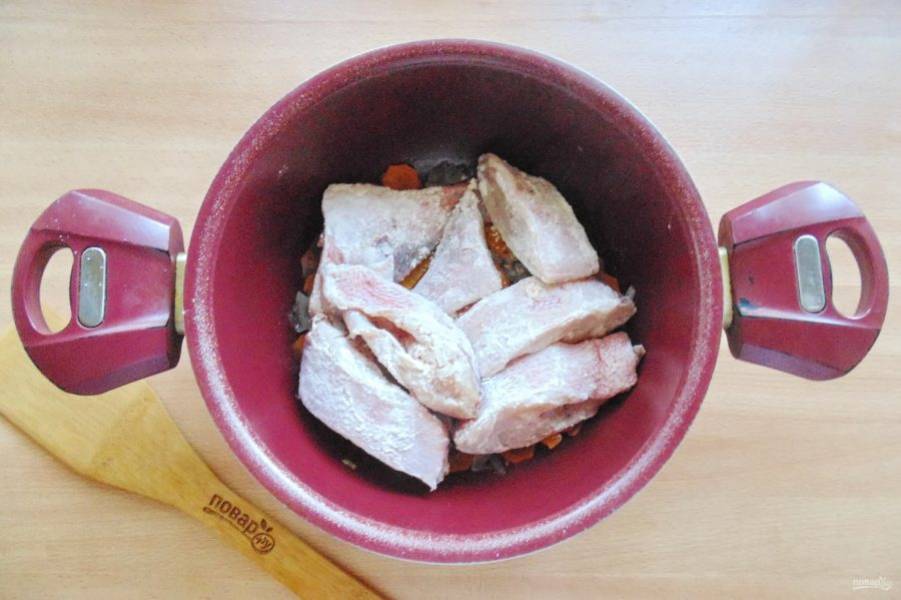 Кусочки окуня обваляйте в муке и выложите в кастрюлю на овощи.