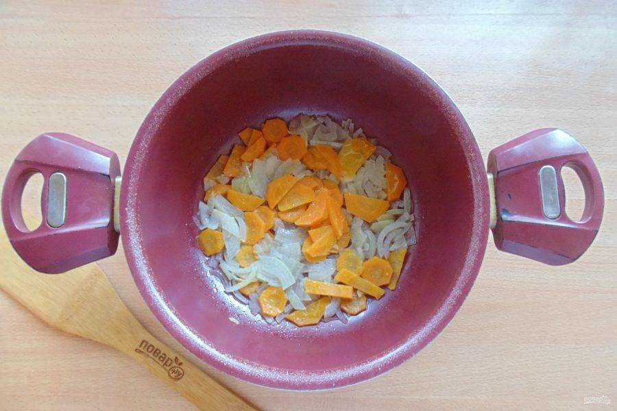 Морковь очистите, нарежьте тонкими кружками и выложите к луку. Добавьте подсолнечное масло.