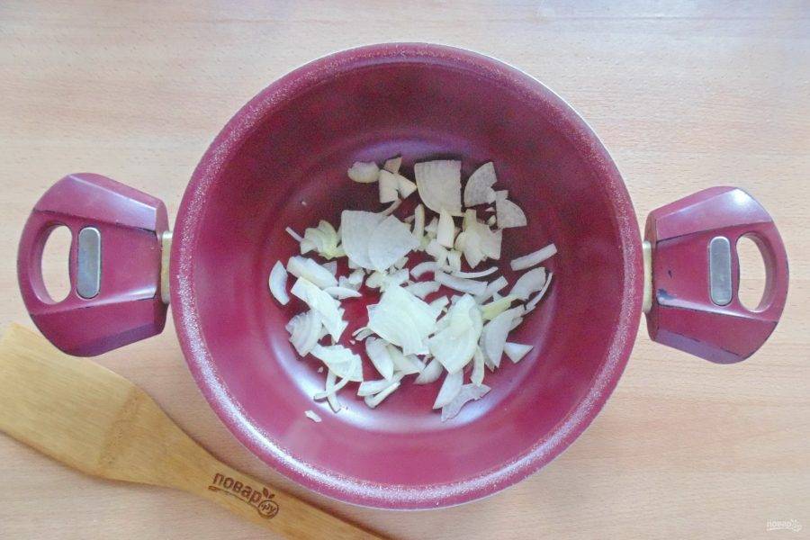 Лук очистите, ополосните, нарежьте полукольцами. Выложите в кастрюлю с антипригарным покрытием.