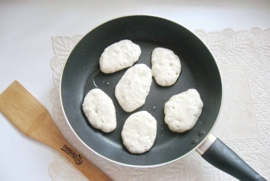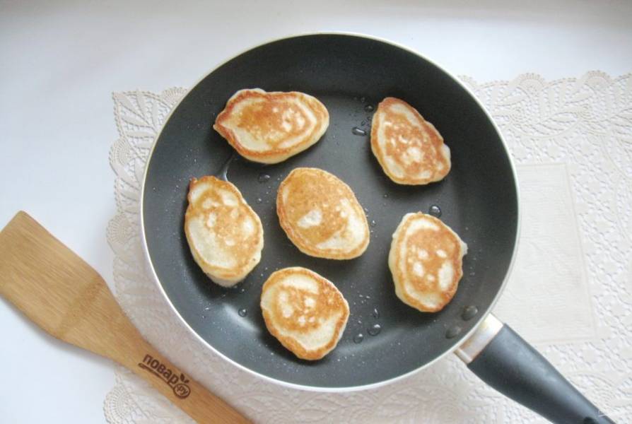 Жарьте оладьи с обеих сторон до румяной корочки.