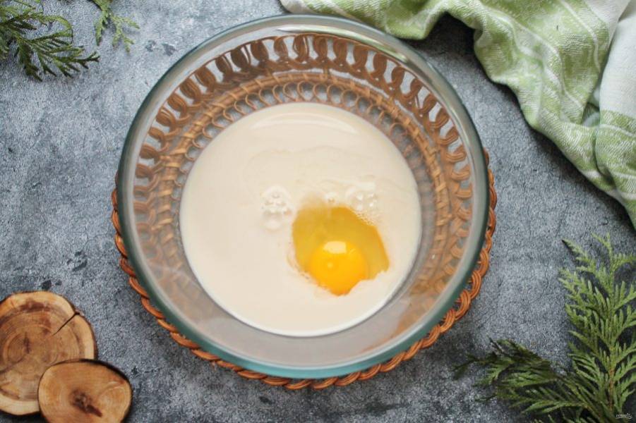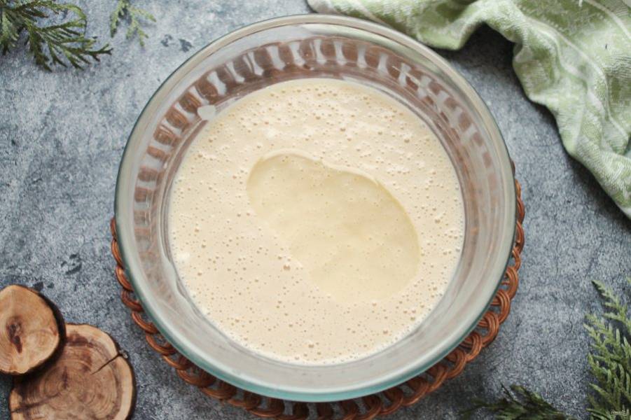 Муку смешайте с разрыхлителем и просейте в молочную массу. Все хорошо перемешайте до однородного теста. Влейте в тесто растительное масло и дайте постоять 10 минут.