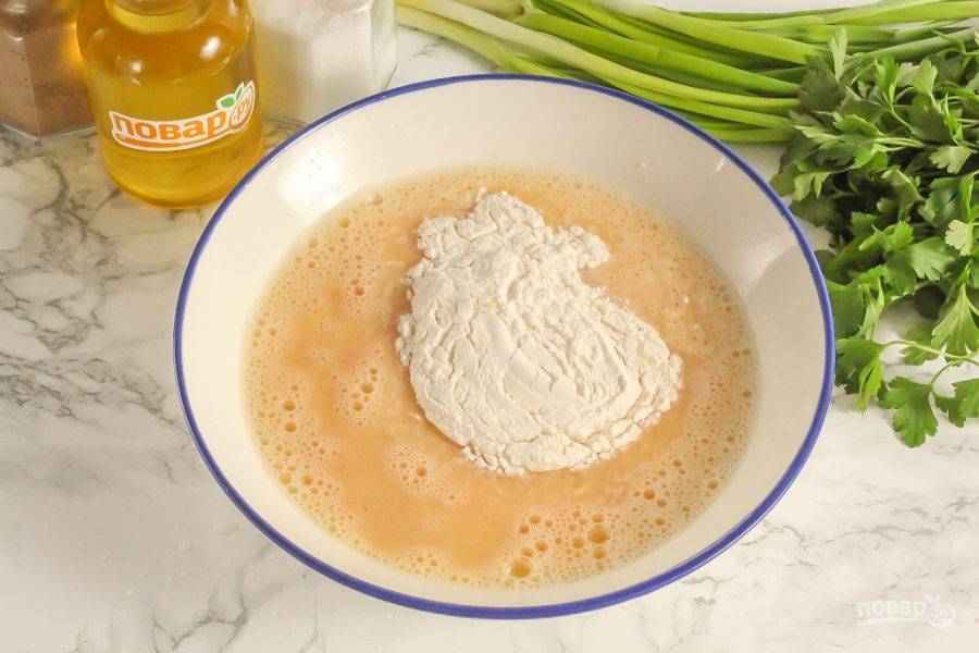 Всыпьте муку и разрыхлитель, тщательно перемешайте, чтобы не образовались комочки. Влейте 1 ст.л. растительного масла без аромата и снова перемешайте. Тесто полностью готово!