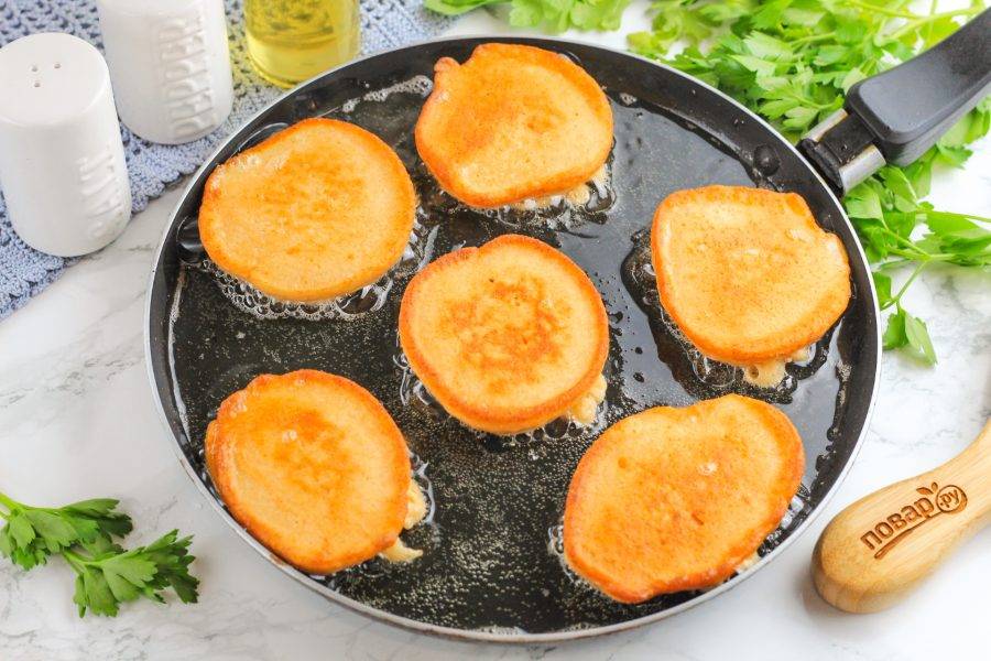 Прогрейте в сковороде растительное масло до кипения и убавьте нагрев до умеренного. Выложите тесто в масло столовой ложкой и слегка разровняйте. Испеките оладьи по 1-2 минуты с одной стороны.